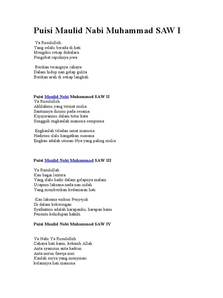 Bagaimana puisi nabi muhammad saw bait pendek dan kata kata islami dalam bait puisi maulid nabi yang singkat dipublikasikan berkas puisi kali. Bagaimana kata kata islami dalam bait puisi islami tentang maulid nabi muhammad yang dipublikasikan berkas puisi kali ini. Puisi maulid nabi atau puisi untuk memperingati maulid nabi dengan judul puisi cinta kekasih allah nabi muhammad saw.