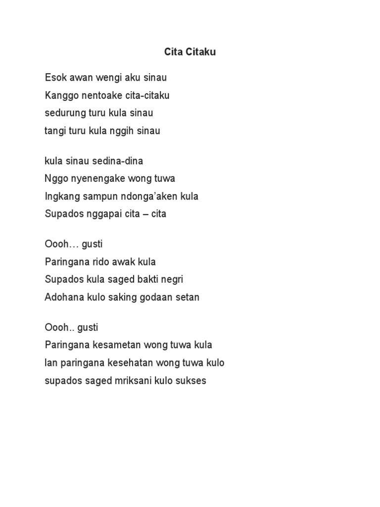Saben dina Aku tansah ana njero ruanganmu Ngrungokake piwulange bapak ibu guru Apa sing kudu digugu lan ditiru. Geguritan lingkungan adiwiyata geguritan merupakan seni sastra puisi yang ditulis menggunakan bahasa jawageguritan bahasa jawa sudah ada sejak jaman kerajaan dan jaman penjajahan kolonial dulu. Sakjroning keselku ana esemu Sekolah ku kuat tanpa sambat Mung kanggo kamulyanku ing tembe mburi.