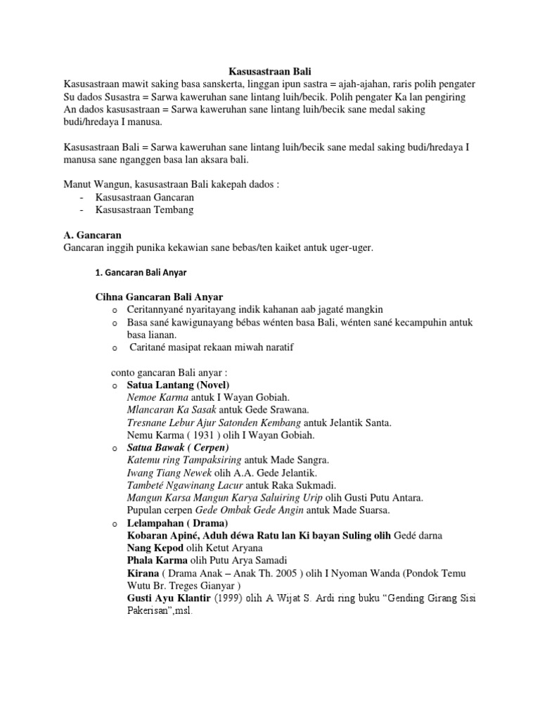 Nov 29 2013 Kesusastraan Bali Purwa. 1 Gancaran Prosa 2 Puisi Puisi 3 Lelampahan Drama. Teks prosa sane manurda tresna sida gelahang.