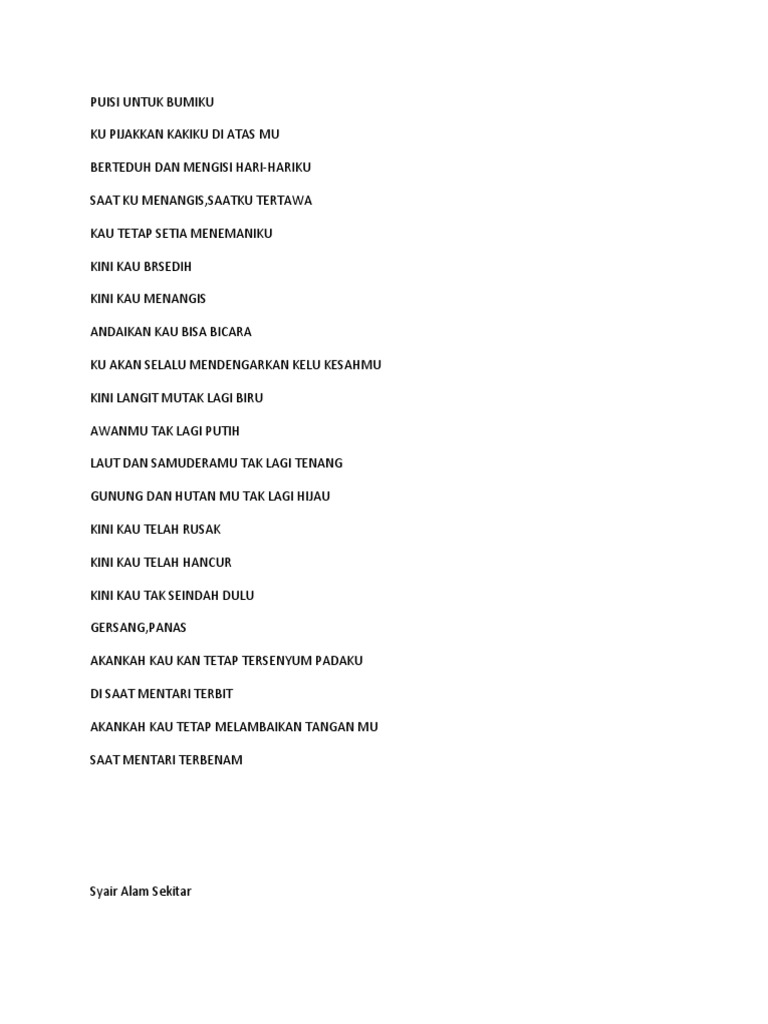 Puisi Tentang Alam dan Lingkungan Menulis puisi alam merupakan salah satu cara untuk mengungkapkan ketakjuban akan keindahan alam dan segala isinya. Tumbuh subur padi dan jati di tubuhmu hembusan angin menjadi penyejukmu Puisi Indah Singkat Terbaru 2021 Tentang Bumiku. Tanpa polusi Hai kawan Jadikan bumi lebih indah.