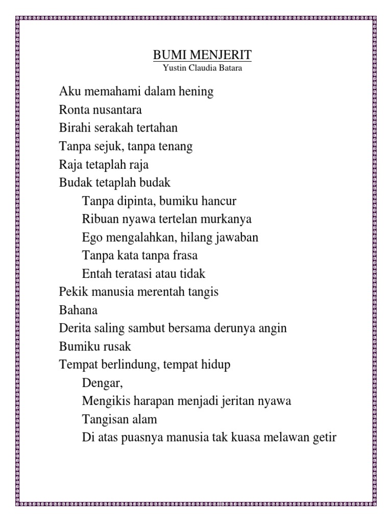 Puisi tentang alam bentuk karya sastra yang digunakan untuk mengekspresikan diri. Mengapa bumiku terus saja berduka. Bersih bagai kemeja tanpa noda.