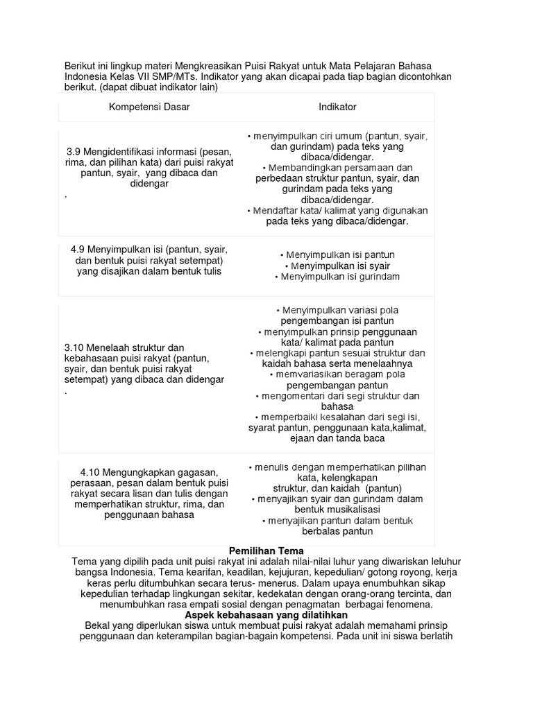 Pengertian teks puisi rakyat merupakan kesusatraan rakyat yang sudah tertentu dari segi bentuknya. Pada umumnya puisi rakyat terdiri dari beberapa deret kalimat ada yang berdasarkan panjang pendeknya suku kata ada yang berdasarkan dari mantra lemah tekanan suara atau juga hanya berdasarkan dari irama. 91 Bahasa Indonesia Bagian D 410 Mengungkapkan gagasan perasaan pesan dalam bentuk puisi rakyat secara lisan dan tulis dengan memperhatikan struktur rima dan penggunaan bahasa Indikator menulis puisi rakyat dengan memperhatikan pilihan kata kelengkapan struktur dan kaidah puisi rakyat pantun menyajikan syair dan gurindam dalam bentuk musikalisasi.