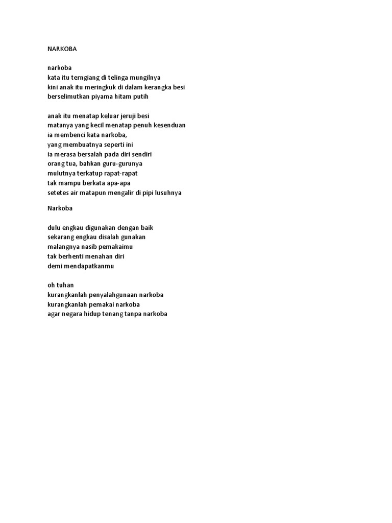 Puisi tentang narkoba narkoba laknat puisi tentang narkoba ini dapat di golongkan kedalam puisi penyesalan. Sebagai inspirasi dan motivasi. Yang kini gaungnya masih menggema.
