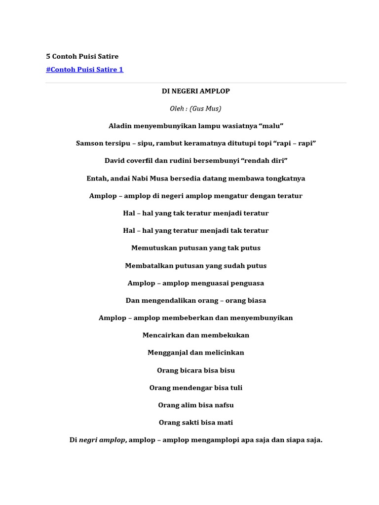 Satire juga bisa diartikan sebagai puisi yang isinya mengecam mengejek dengan kasar dan tajam suatu ketidakadilan dalam masyarakat secara singkat pengertian puisi satire yaitu salah satu jenis puisi baru yang berisikan sindiran atau kritikan. Pada kesempatan kali ini admin bakal sedikit sharing tentang kumpulan contoh puisi. Setiap barisnya merupakan kesatuan sintaksis.