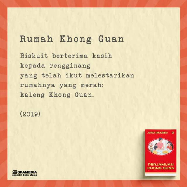 PT Gramedia Pustaka Utama Tahun terbit. Puisi ini terdapat dalam buku puisi Perjamuan Khong Guan yang terbit bulan 26. Buku berisi 80 puisi tersebut diluncurkan di Jakarta Minggu 2612020.