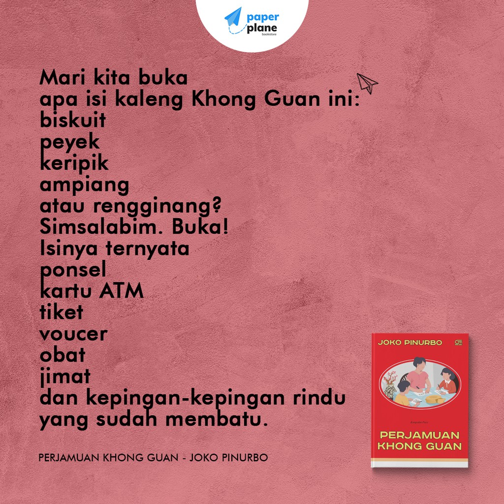 Please see Wikipedias template documentation for further citation fields that may be required. PERJAMUAN KHONG GUAN Penulis. Namun ketika selesai berbelanja dan sedang menuju ke kasir mata saya langsung tertuju pada display yang memajang buku berwarna merah yang ternyata adalah buku kumpulan puisi Perjamuan Khong Guan karya Joko Pinurbo.
